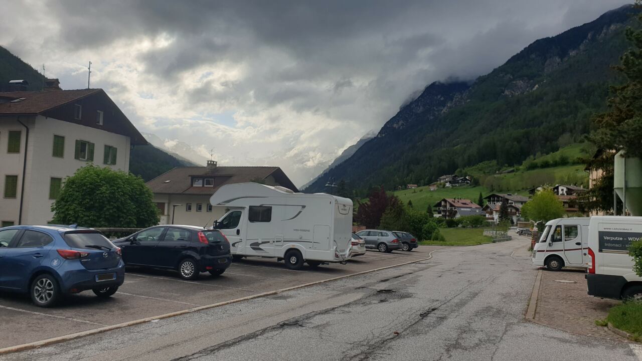 Am Donnerstag, den 23.05. war es dann endlich soweit. Unser Wohnmobil hatten wir bereits am Tag zuvor reisefertig gemacht, sodass wir am Vormittag nur noch einsteigen mussten und abfahren konnten. Wir starteten gegen 9:30 Uhr und kamen eigentlich auch richtig gut voran. Hier und da gab es ein wenig zähfließenden Verkehr, aber nichts Tragisches – bedenkt man, dass Pfingstferien waren. Ein kurzer Hagelschauer in Österreich wollte uns den Tag vermiesen, schaffte es jedoch nicht, da nach kurzer Zeit die Sonne wieder Oberwasser bekam. Der erste größere Stau erwartete uns schließlich kurz nach dem Brenner, den wir jedoch dank Navi geschickt umfuhren. Die Strecke abseits der Autobahn wurde dann zwar etwas anspruchsvoller, aber dafür wunderschön. Letztendlich landeten wir in Gossensaß, dem ersten Dorf südlich des Brennerpasses in Südtirol (Italien), wo wir auf Park4night einen Übernachtungsplatz fanden.