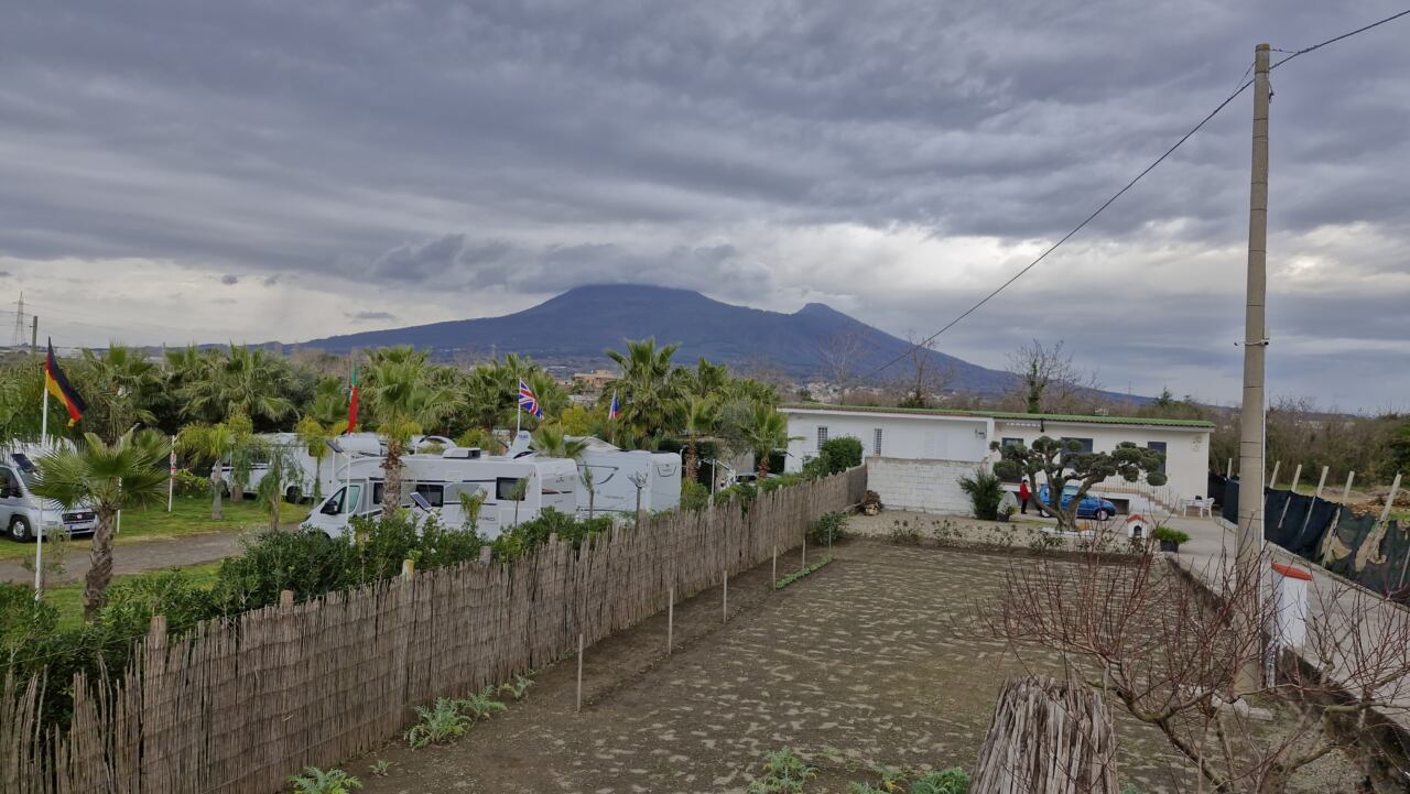 Für Mittwoch stand die Besichtigung Pompejis auf dem Plan. Da wir diese bereits früh starten wollten machten wir uns schon am Dienstag auf den Weg zu dem Stellplatz, den wir als Ausgangspunkt für unsere Tour ausgesucht haben. Doch unterwegs wollten wir erst einmal Gasstationen anfahren, denn aufgrund der eisigen Temperaturen in Deutschland und Österreich war unsere erste Flasche bereits leer. Also hieß es nun jemanden zu finden, der deutsche Gasflaschen auffüllte. Nachdem wir beim ersten Händler eine direkt Absage erhielten, hatten wir bereits beim zweiten Versuch Glück. Bei BA.CO.GAS in Ponte Ricco bekamen wir unsere 11kg-Flasche für 18 Euro direkt aufgefüllt. Nun konnte es – bei zum Teil starkem Regen – weiter Richtung Pompeji gehen. Kurz vor dem Ziel sorgte unser Navi jedoch noch für eine unerwartete Herausforderung, als es uns unnötigerweise durch eine enge, stark befahrene Gasse lotste. Doch schließlich erreichten wir am Nachmittag unseren Stellplatz und waren mit unserer Wahl mehr als zufrieden. Die Besitzerin empfing uns mit einer Herzlichkeit, wie sie wohl nur Italiener können – inklusive Limoncello und Schokolade. Der kleine, charmante Platz „Agricamper La Giuliana“ bot für 25 Euro alles, was man brauchte, dazu einen herrlichen Blick auf den Vulkan Vesuv.