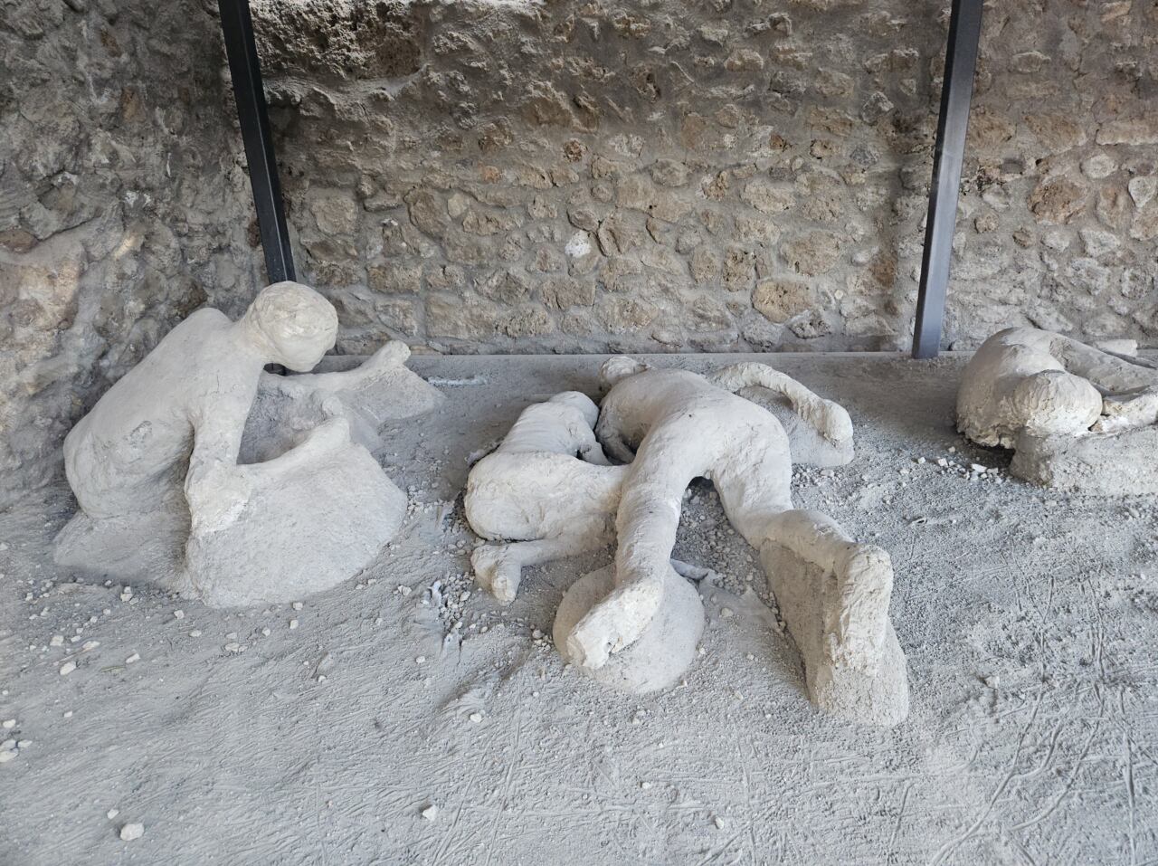 Und dann endlich betraten wir diese weltberühmte Ruinenstadt, die 79 n. Chr. durch einen gewaltigen Vulkanausbruch des Vesuvs unter einer meterhohen Ascheschicht begraben wurde. Jetzt – fast 2000 Jahre später – vor genau diesen Gebäuden und Mauern zu stehen ist faszinierend und surreal zugleich. Man kommt nicht umhin sich den damaligen Alltag auf genau dieser Straße, auf der man selbst gerade steht, vorzustellen. Auf den enorm großen Pflastersteinen sind zum Teil sogar noch Furchen der Karren und Kutschen zu erkennen. Während man durch die alten Straßen schlendert, hat man das Gefühl, direkt in das Leben der Römer einzutauchen. Die gut erhaltenen Häuser mit ihren farbenfrohen Fresken, die beeindruckenden Tempel und das große Amphitheater erzählen von einer blühenden Stadt, die so plötzlich zum Stillstand kam. Auch zahlreiche Opfer bzw deren Gipsabdrücke sind zu sehen. Menschen, die damals überrascht wurden und binnen Sekunden starben – ein stilles Zeugnis ihrer letzten Momente.