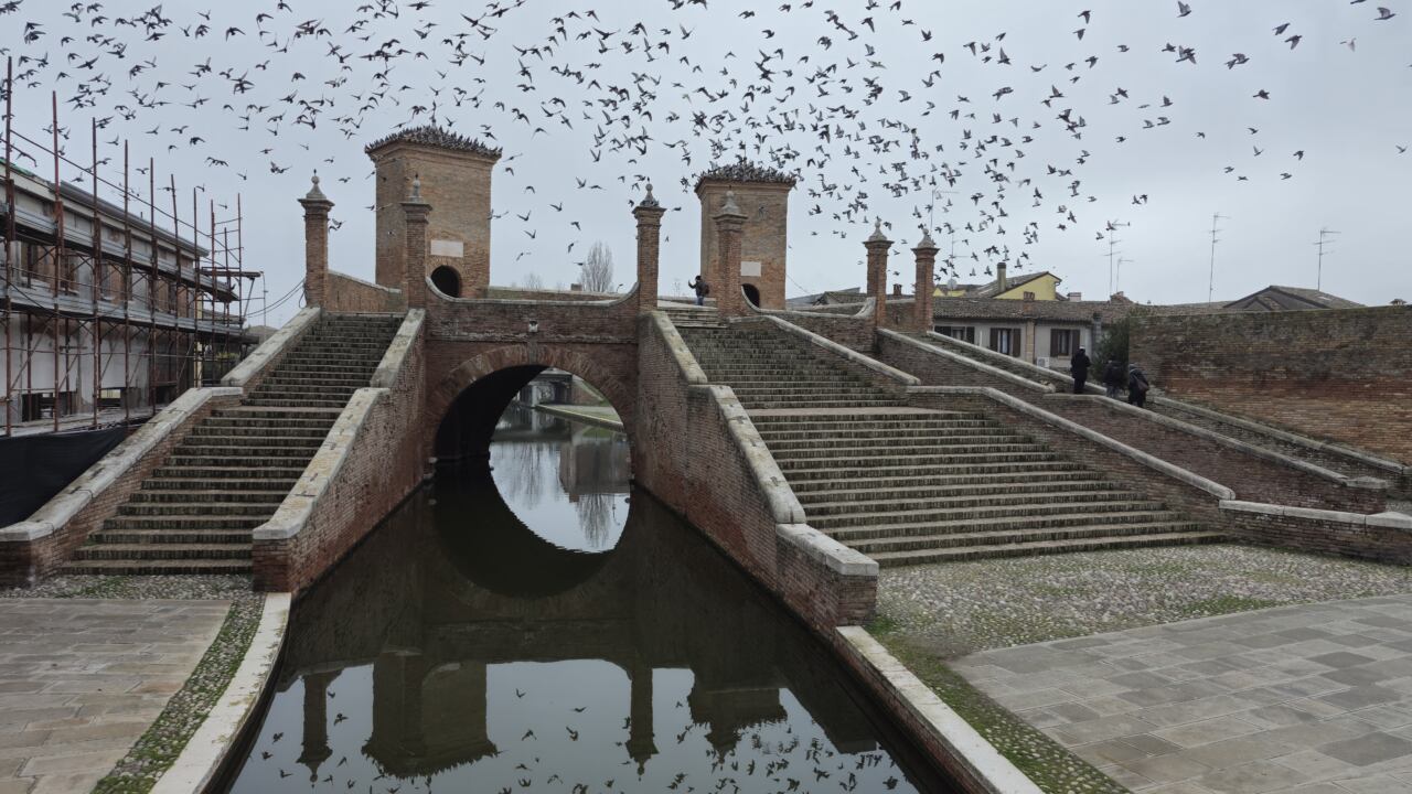 Nach einem kurzen Fußmarsch vom Parkplatz aus standen wir vor der „Ponte dei Trepponti“ – dem Wahrzeichen von Comacchio. Diese imposante Brücke verfügt über fünf Treppen und thront genau dort, wo fünf Kanäle zusammenfließen – ein echter Hingucker! Auf den Turmdächern versammelten sich zahllose Tauben, die immer mal wieder in perfekter Synchronisation über die Besucher hinwegflogen – fast wie eine kleine Flugshow.