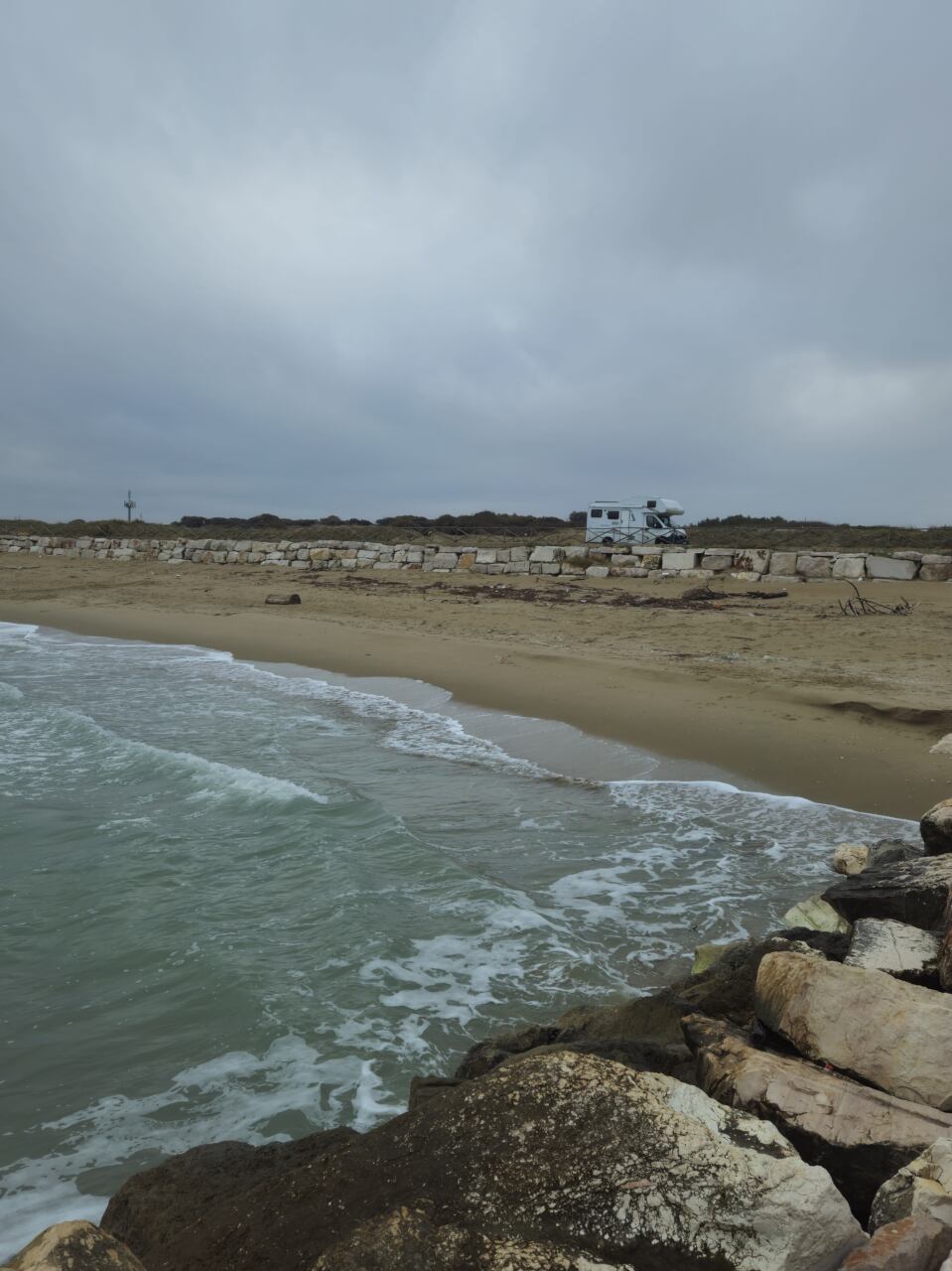 Nach nun knapp 1000 gefahrenen Kilometern beschlossen wir, dass es Zeit wurde das Meer zu sehen. So starteten wir am Morgen Richtung dem kleinen Küstenort Piombino. Der von uns angepeilte Stellplatz direkt am Meer war leider bereits voll belegt, sodass wir zunächst etwas planlos weiterfuhren – was sich im Nachhinein jedoch als Glücksfall herausstellte. Denn nach einem kurzen Marktbesuch und Einkauf in Riotorto fanden wir schließlich einen Platz, der den vorherigen bei Weitem übertraf und absolut nicht überlaufen war. Mit direktem Zugang zum nur ca. 100 Meter entfernten Meer konnten wir abends mit Wellenrauschen einschlafen und morgens aufwachen. Es handelte sich hierbei um einen Stellplatz (parcheggio camper) der in der Nebensaison kostenlos genutzt werden kann. Auch das Wetter spielte mit – 16 Grad und purer Sonnenschein – was will man mehr?! So beschlossen wir hier gleich zwei Nächte zu verbringen um in der Sonne zu entspannen und unsere nächsten Ziele festzulegen.