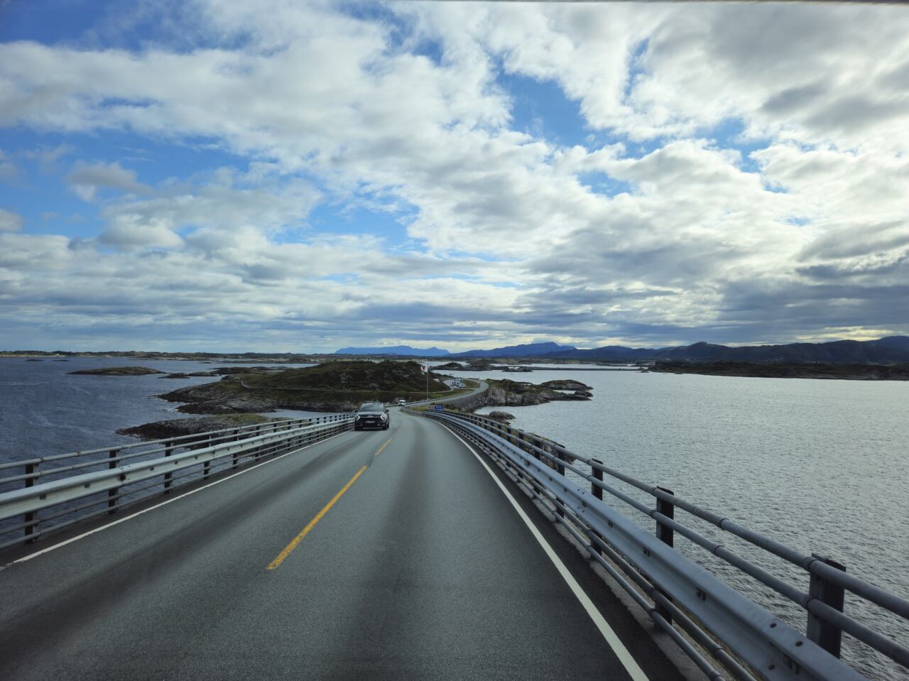 Also machten wir uns auf den Weg zur berühmten Atlantikstraße. Obwohl wir gespannt waren, hielten wir unsere Erwartungen bewusst niedrig. Schließlich hatten wir schon oft gehört, dass die beeindruckenden Luftaufnahmen dieser Straße (die man im Internet zu genüge sieht) nicht mit dem Blick vom Boden aus vergleichbar sind. Doch einige Abschnitte faszinierten uns trotzdem. Die Straße schien an einer Stellen geradewegs in der Luft zu enden und sobald wir den höchsten Punkt erreichten, bot sich uns ein spektakulärer Anblick: Die Straße schlängelte sich wie ein Band durch das Meer. Über insgesamt acht Brücken erstreckt sich die malerische Küstenstraße, dabei eröffnen sich grandiose Ausblicke auf das Meer, schroffe Felsformationen und kleinen Inseln. Die einzigartige Kombination aus überwältigender Naturkulisse und technischer Meisterleistung macht die Fahrt zu einem unvergesslichen Erlebnis – einfach nur WOW! Leider war der Zauber mit einer Gesamtlänge von knapp über acht Kilometern viel zu schnell vorbei.