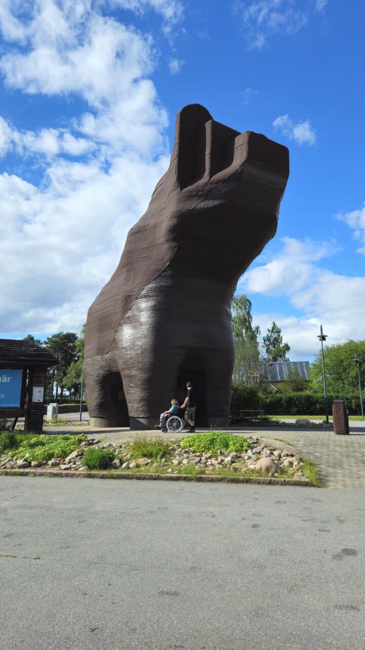 Da es mal wieder Zeit für Ver- und Entsorgung war und wir uns nach einer ausgiebigen Dusche sehnten, steuerten wir einen ca 120 km entfernten Campingplatz in Sveg an, auf dem wir auch problemlos noch einen Stellplatz bekamen (Kosten 29,99 Euro ohne Strom). Da das Wetter mittlerweile wirklich herrlich war (22-24 Grad und Sonne), beschlossen wir, gleich noch eine zweite Nacht zu buchen um den nächsten Tag einfach mal nur in der Sonne zu entspannen. Praktisch war auch der große Einkaufsladen direkt nebenan, in dem wir morgens nicht nur frische Brötchen bekamen sondern uns auch gleich mit Vorräten eindecken konnten. Und natürlich durfte auch ein Spaziergang zur wohl weltweit größten Bärenskulptur hier nicht ausgelassen werden. Seit 2005 prangt der 13 Meter hohe und 80 Tonnen schwere hölzerne Bär als neues Wahrzeichen auf der Hauptkreuzung von Sveg, das sich damit als Tor zu Härjedalen betrachtet.