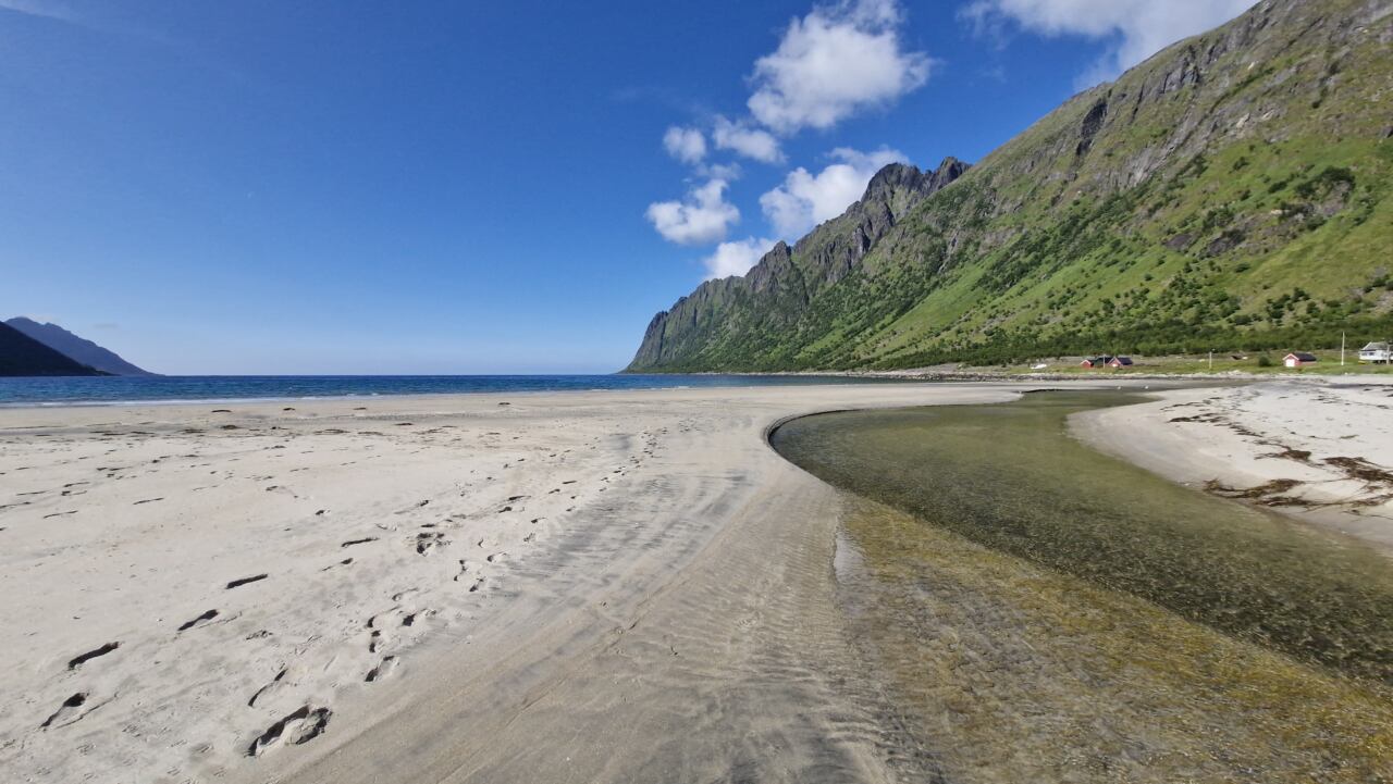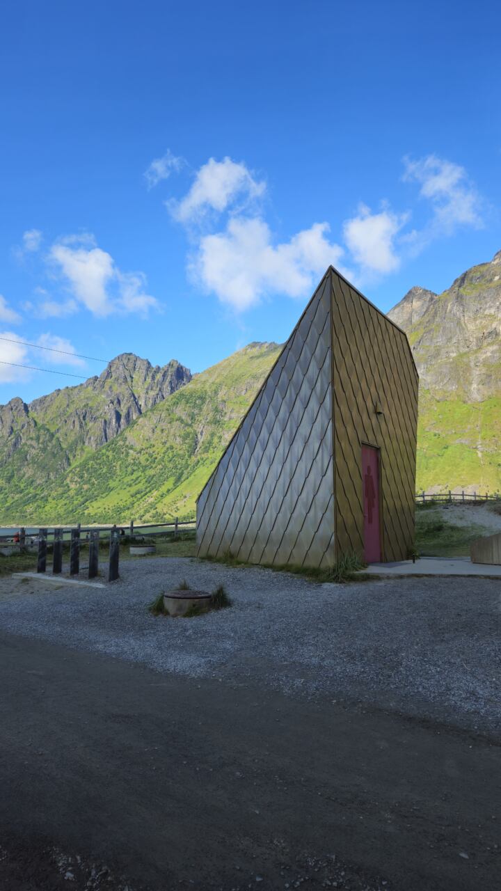 Unsere Mühen wurden jedoch mehr als belohnt, als wir endlich den Ersfjord Beach erreichten. Der feine, weiße Sandstrand und das türkisblau schimmernde Wasser ließen sofort erkennen, warum dieser Ort als einer der schönsten Strände Senjas gilt. Eingerahmt von majestätischen, schroffen Berggipfeln präsentiert sich Norwegen hier in seiner eindrucksvollsten Pracht. Ein etwas spezielleres Highlight ist dagegen hier das auffällige, dreieckige Toilettengebäude auf den Parkplatzgelände, dessen goldglänzende Fassade zu einer außergewöhnlichen Attraktion geworden ist.