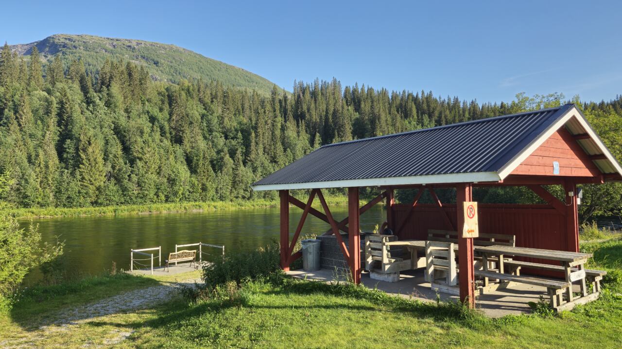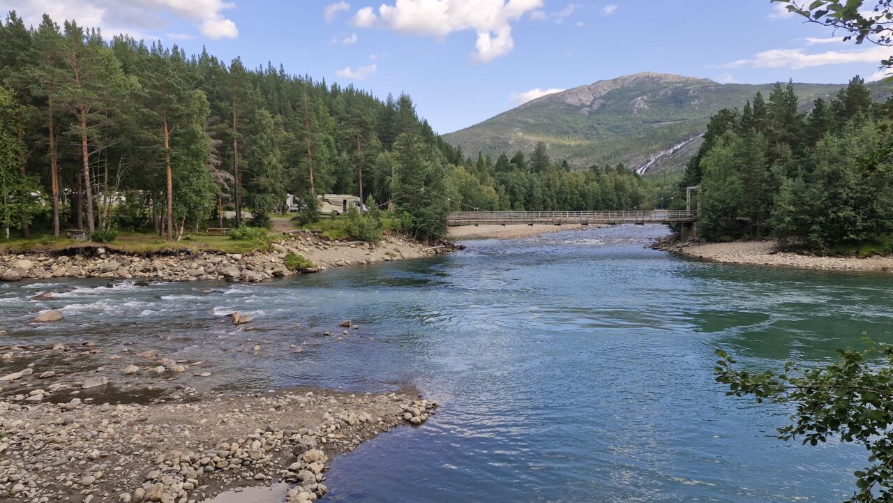 Das Thermometer kletterte mittlerweile auf 27 Grad – ein Tag, der viel zu schön war, um ihn ausschließlich mit Fahren zu verbringen. So führte uns unser Weg erneut auf einen Campingplatz (400 NOK), wo wir nicht nur die Sonne in vollen Zügen genießen, sondern das herrliche Wetter auch für eine kleine Wäschepause nutzen konnten. Der Korgen Camping AS liegt etwa 37 Kilometer südlich von Mo i Rana und ist bequem von der E6 aus erreichbar. Eingebettet in eine idyllische Landschaft am Fluss bietet er nicht nur eine malerische Kulisse, sondern auch die perfekte Gelegenheit für eine erfrischende Abkühlung. Bei einem abendlichen Spaziergang wurden wir schließlich mit dem Anblick springender Forellen belohnt – ein wunderbarer Abschluss dieses entspannten Sommertags.