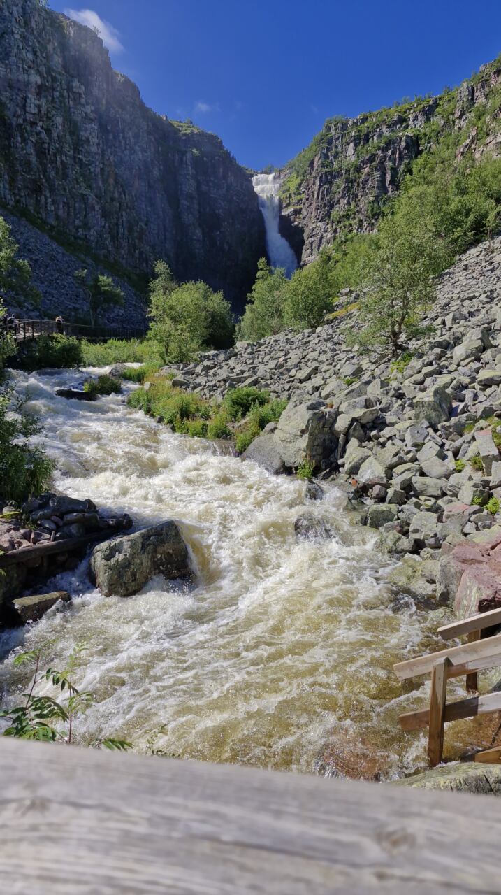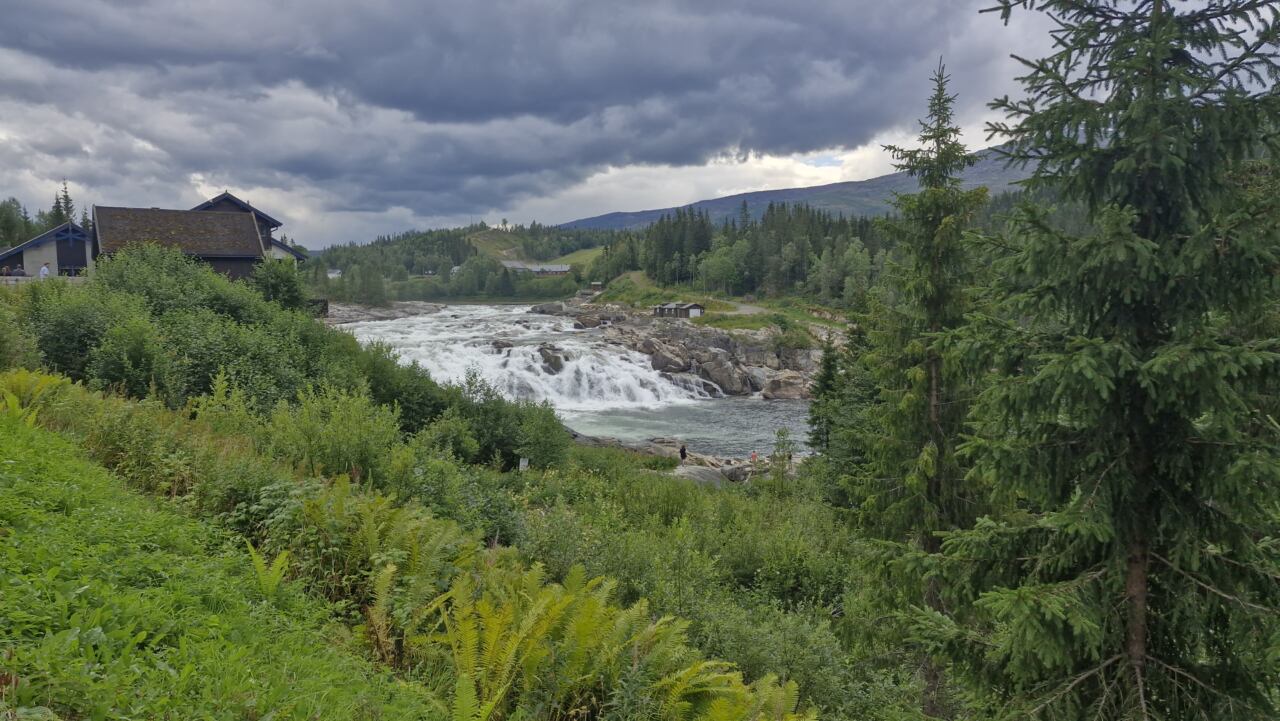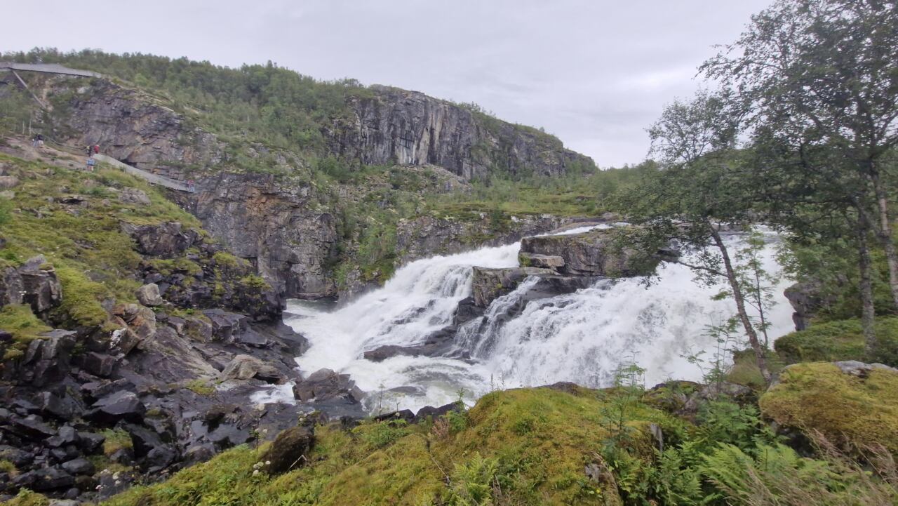 Mit frisch aufgefüllten Kleiderschränken setzten wir unsere Reise am nächsten Tag fort. Unser Ziel war Laksforsen, ein mächtiger und breiter Wasserfall (im Fluss Vefsna) mit springenden Lachsen, welcher in der Grane Kommune in Nordland direkt an der E6 liegt. Mit 17 Meter ist er zwar nicht der höchste aber angeblich wohl der wasserreichste Wasserfall in Norwegen.