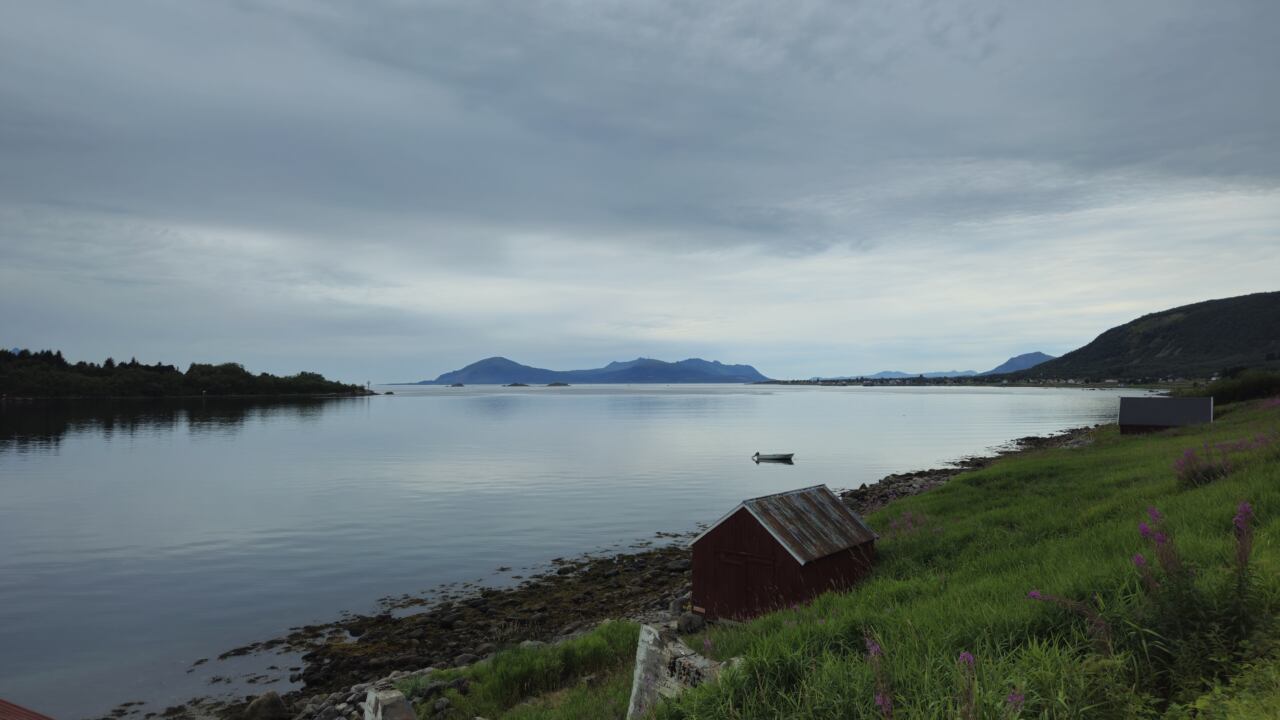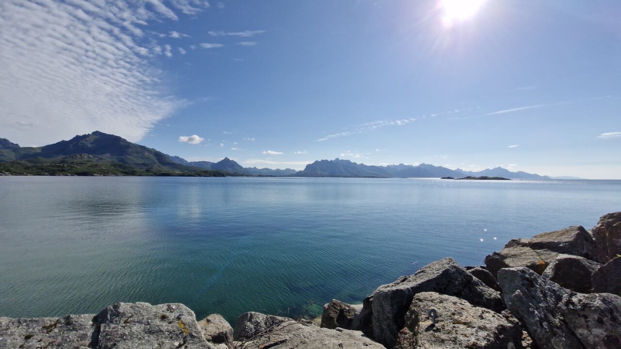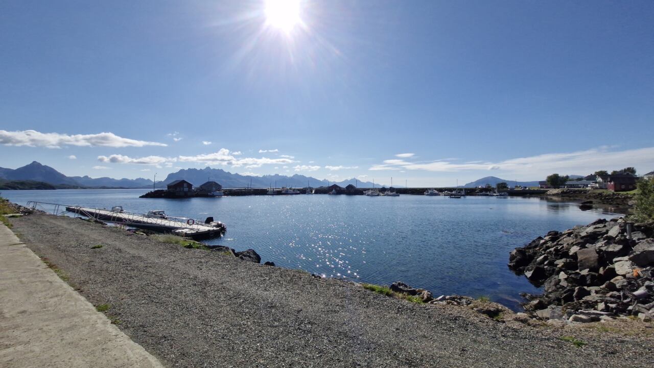 Mit frischem Proviant an Bord fuhren wir zunächst die gleiche Strecke bis Alta zurück und nahmen dort die Küstenstraße in Richtung Lofoten. Bei Alteidet fuhren wir schließlich den Campingplatz Arctic FjordCamp (400 NOK inklusive Strom, Dusche und WLAN) an, um hauptsächlich zu Ver- und Entsorgen. Der Platz bot nicht nur die Möglichkeit, eine dringend benötigte Dusche zu genießen, sondern auch eine traumhafte Aussicht auf das Fjord und die umliegenden Berge. Nach dem Trubel am Nordkap war dieser Ort eine wahre Oase der Ruhe und Idylle, die wir in vollen Zügen genossen – was uns bei angenehmen 26 Grad und Sonne nicht wirklich schwer fiel.