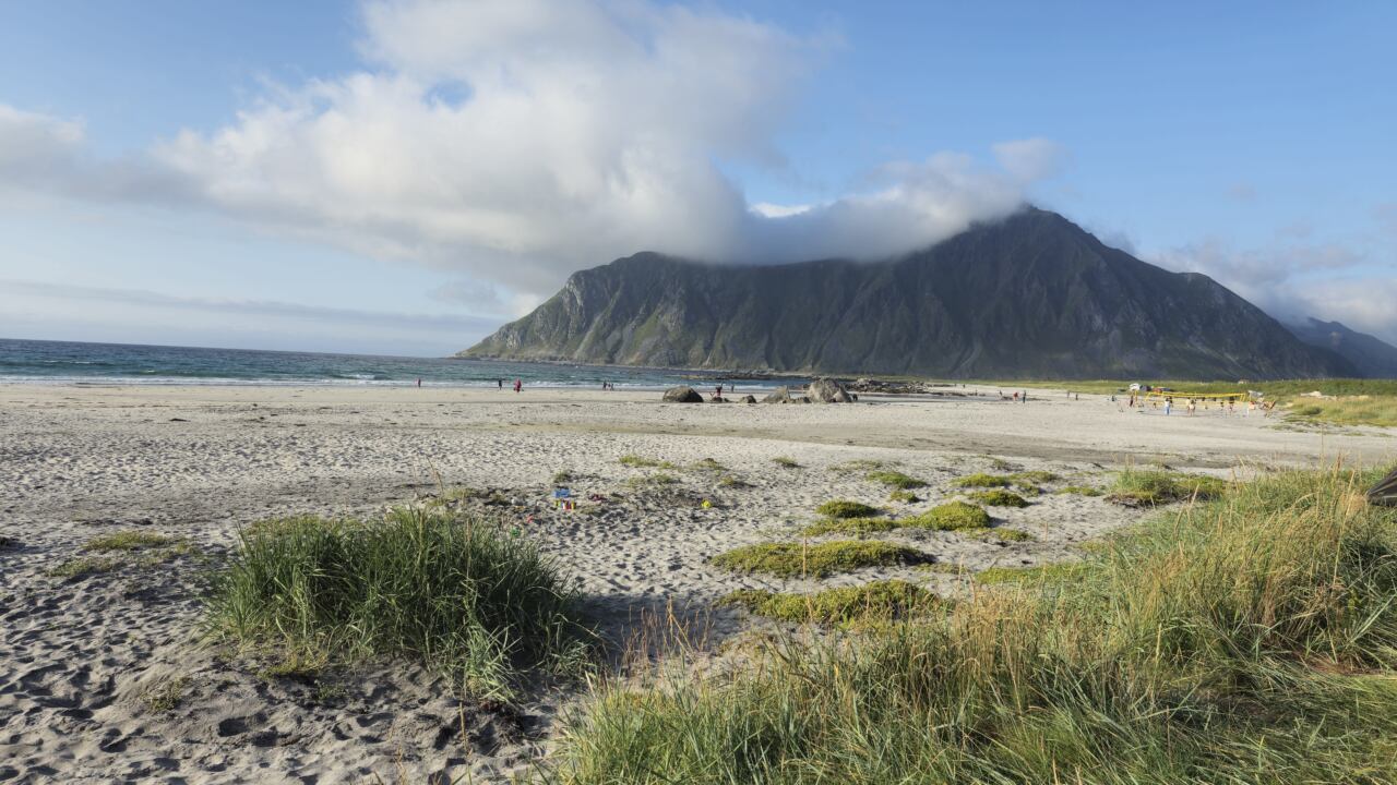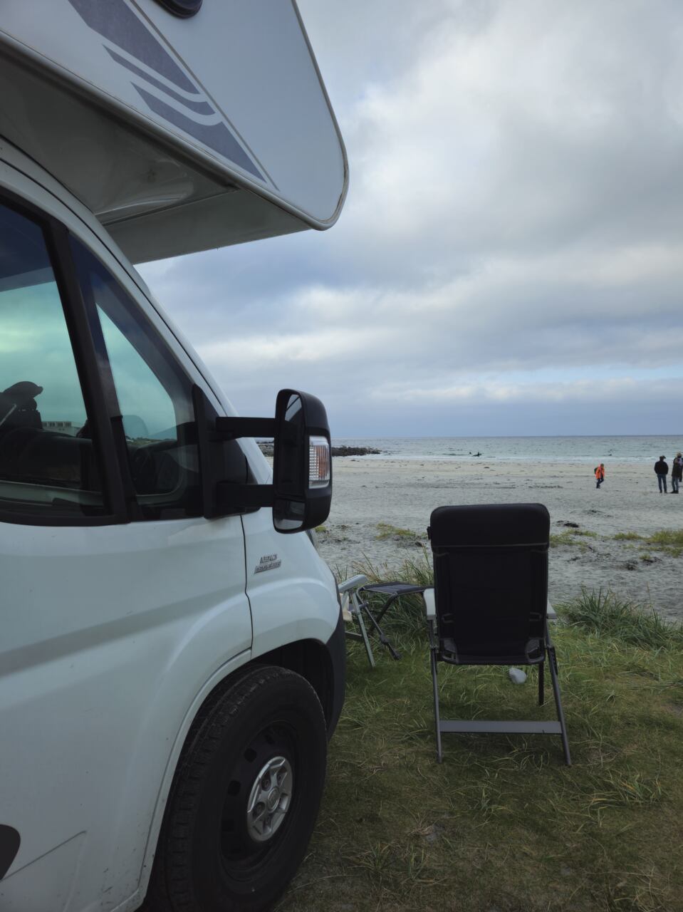 Ohne ein wirkliches Ziel vor Augen setzten wir unsere Fahrt erst mal entlang der E10 fort, bis wir zufällig auf einen weiteren traumhaften Strand stießen. Dieser war (im Vergleich zu den anderen Stränden) nahezu menschenleer und beherbergte einen Campingplatz, der noch reichlich freie Stellplätze bot. Zwar ist das Lofoten Beach Camp mit 380 NOK/Nacht nicht gerade günstig, doch die Lage ist einfach unschlagbar: Campen direkt am weißen Sandstrand, mit einem atemberaubenden Blick auf das Meer, was will man mehr!?