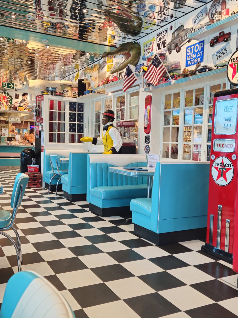 Der nächste Tag führte uns in Richtung Trondheim – bisher die größte Stadt, die wir auf unserer Liste hatten. Unterwegs stießen wir zufällig auf das charmante Pick Up Café in Vuddu Valley in der Nähe von Äsen. Dieses kleine Juwel erwies sich als eine wahre Schatzkammer für Liebhaber amerikanischer Nostalgie: Von alten amerikanischen Fahrzeugen über unzählige Vintage-Accessoires bis hin zu einer authentischen Retro-Tankstelle gab es hier unglaublich viel zu entdecken. Wir waren fasziniert von diesem „Little America“ mitten in Norwegen und ließen uns die Gelegenheit nicht entgehen, im dazugehörigen Shop ein paar besondere Souvenirs zu erwerben. Spontan beschlossen wir in dem dazugehörigen Diner – natürlich auch ganz im American Style – zu essen, bevor es wieder zurück auf die Straße ging.