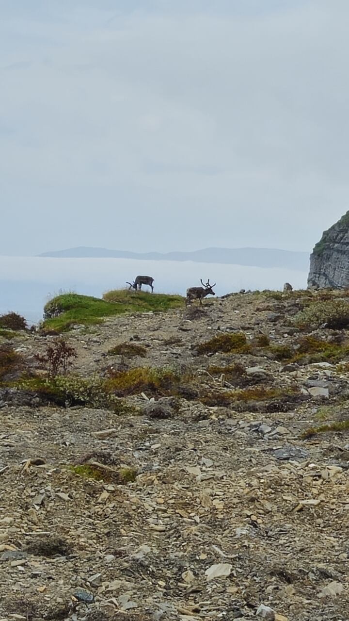 Am nächsten Morgen um 9 Uhr brachen wir voller Vorfreude zum Nordkap auf. Zuvor galt es jedoch, eine Tankstelle zu finden. Denn je weiter nördlich es ging, umso seltener wurden diese. Mit vollem Tank und voller Euphorie ging es dann schließlich los auf die E69 – die nördlichste Straße der Welt mit Anschluss an ein internationales Straßennetz. Bereits die Fahrt dorthin war ein Erlebnis: Die Route schlängelte sich entlang der kurvenreichen Küste, vorbei an atemberaubenden Ausblicken auf das Meer und gesäumt von imposanten Felswänden. Vorbei an etlichen Rentieren und durch den 6,9 km langen Nordkaptunnel, bevor einen dann schließlich die karge Tundralandschaft mit ihrer endlos weit wirkenden baumlosen Silhouette verschluckt. Auf zum Teil steilen Straßen schrauben wir uns so langsam hoch zum Kap und überholen immer wieder Fahrradfahrer, denen wir im Stillen höchsten Respekt für ihre Leistung zollten.