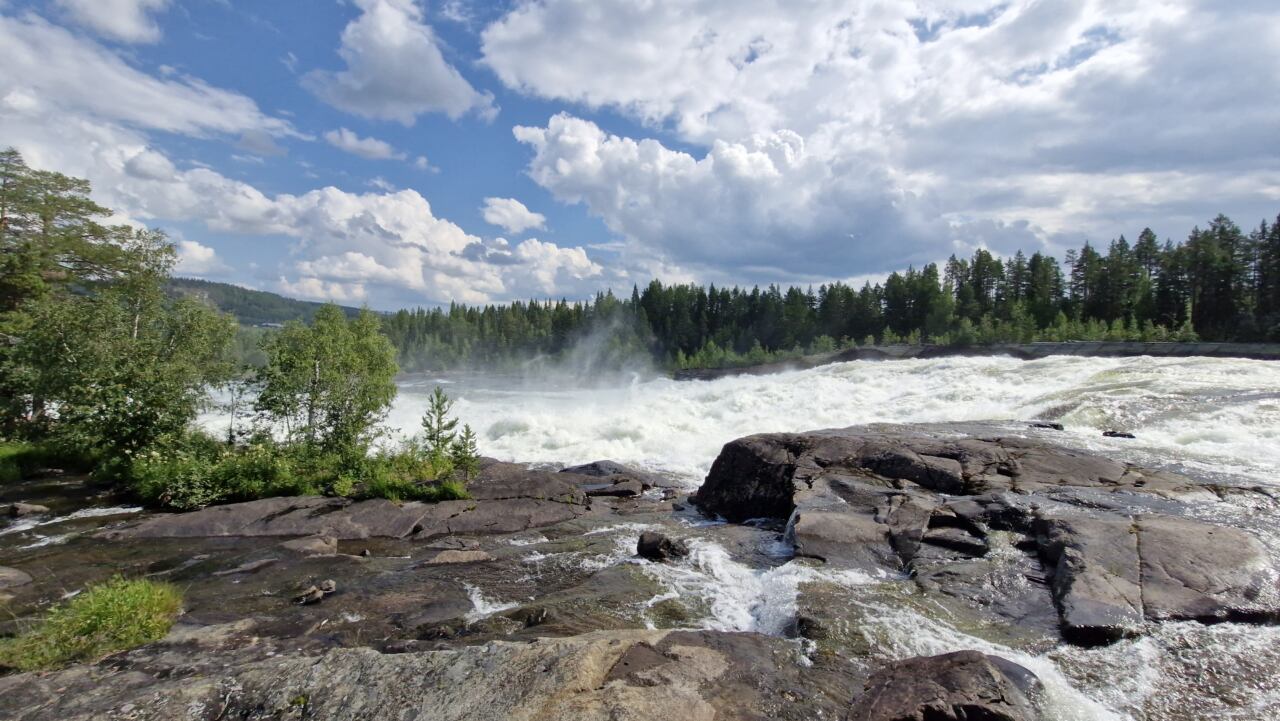 Aufgrund der gemeldeten Regenfront hatten wir eigentlich geplant, den nächsten Tag zu nutzen um Strecke zu machen. Doch ein Blick am morgen auf den Wetterbericht zeigte uns, dass es nun doch trocken und warm (26 Grad) bleiben sollte. So nutzten wir den Tag spontan um die 150 km entfernten Storforsen – Skandinaviens größte Stromschnellen zu besichtigen. Was für eine großartige Entscheidung – Volltreffer!