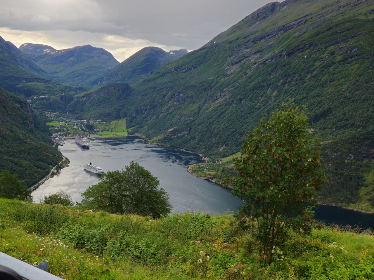 In Geiranger angekommen, hatten wir Glück und fanden nahezu direkt bei Ankunft einen Parkplatz – keine Selbstverständlichkeit bei der Menge an Touristen. Darüber hinaus lagen auch noch zwei großes Kreuzfahrtschiff im Fjord vor Anker, die gerade einen schier endlosen Strom aus Menschen ans Land spülte. Hierdurch herrschte ein quirliges Durcheinander auf der Promenade und wir mittendrin. Nach ein paar Besuche in den zahlreichen Souvenirläden dort, die gefühlt auch immer das gleiche anboten, flüchteten wir wieder in unser Wohnmobil und nichts wie weg.
