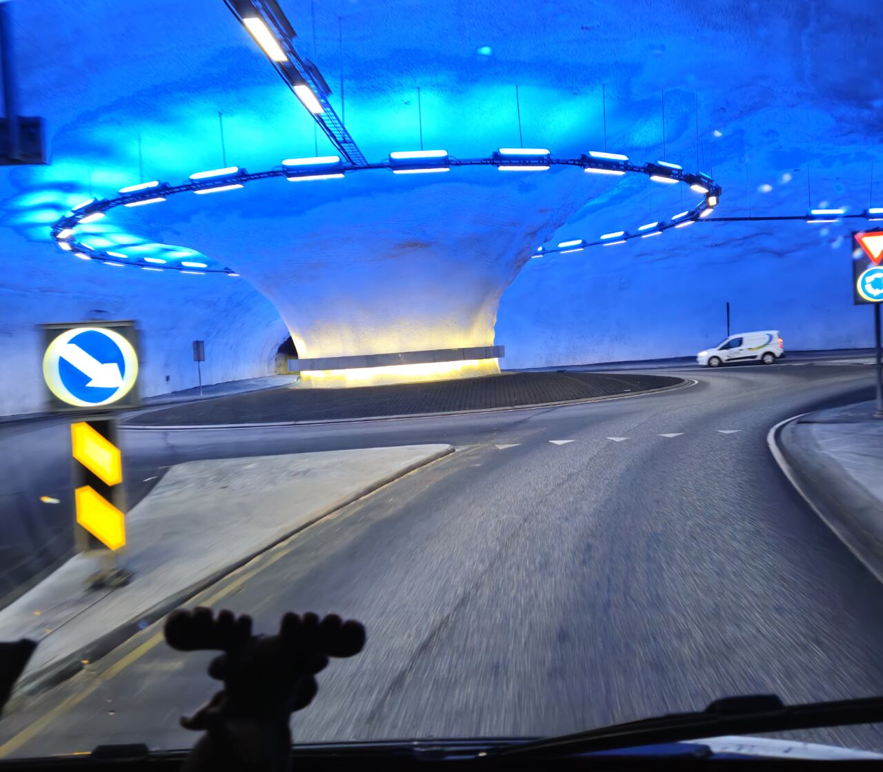 Und tatsächlich ließ das nächste kleine Highlight nicht lange auf sich warten. Wir haben ja bisher in Norwegen schon einige Tunnel durchfahren, darunter auch richtig schmale und dunkle, in die man mit einem Wohnmobil weiß Gott nicht unbedingt freiwillig rein möchte. Wie auch immer, der Vallaviktunnel jedenfalls hat uns schon etwas ins Staunen gebracht. Hier zeigen die Norweger ganz klar, dass sie im Bereich Tunnelinfrastruktur wirklich was drauf haben.