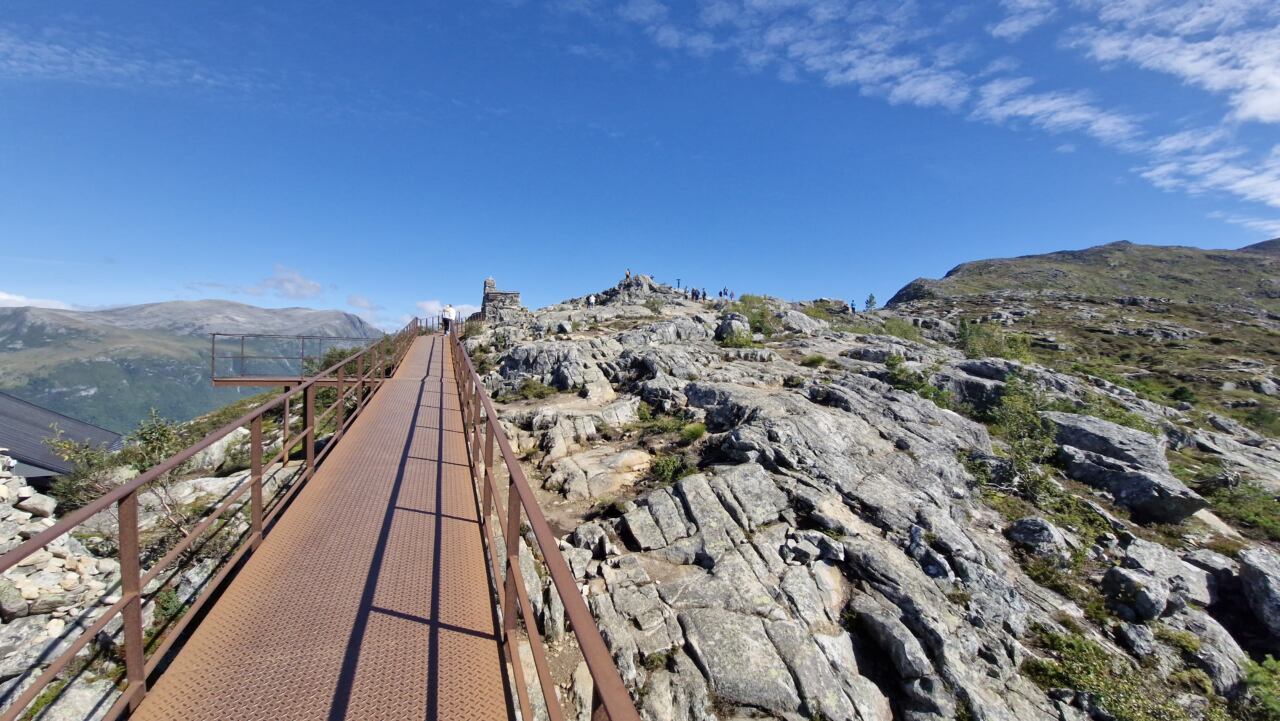 Die letzten Höhenmeter bis zum Gipfel (für die wir nochmal etwa 30 Minuten brauchten) führten dann über eine etwas ausgesetzte steinerne Treppe, die stellenweise mit Metallseilen gesichert war. Oben angekommen fühlten wir uns wie echte Gipfelstürmer und nach einer wohlverdienten Pause im Restaurant, haben wir dann den Rückweg entspannt mit der Seilbahn angetreten (740 NOK für zwei Personen) – die übrigens gerade mal 15 Minuten dauerte.