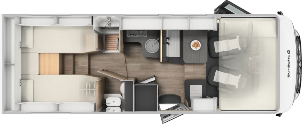 Im Innenraum zeigt der Sunlight I 68 Adventure Edition, worauf es beim Reisen ankommt: Platz, Funktionalität und eine klare Aufteilung. Der Grundriss ist so gestaltet, dass Wohnen, Schlafen und Kochen sinnvoll voneinander getrennt sind, ohne den offenen Charakter zu verlieren.