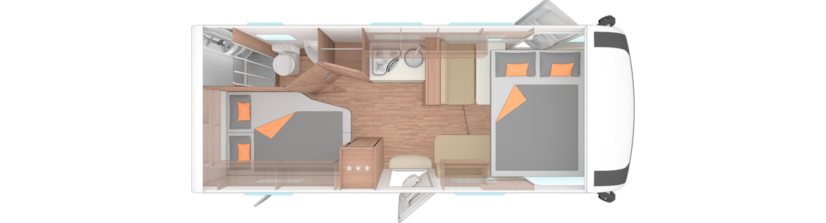 Der 650 MF bietet ein französisches Bett im Heck und eignet sich ideal für Paare, die Wert auf Komfort und ein großzügiges Bad legen.